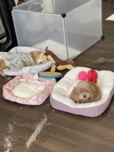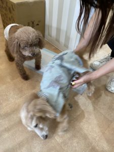 むぎちゃんのお散歩から帰ってきた直後に大雨が降ってきてしまったので、こちちゃんのお散歩は断念(´;ω;`) 毛だらけになってしまったトリミング室でもこのくつろぎようでした💕 のんびりできたね😊